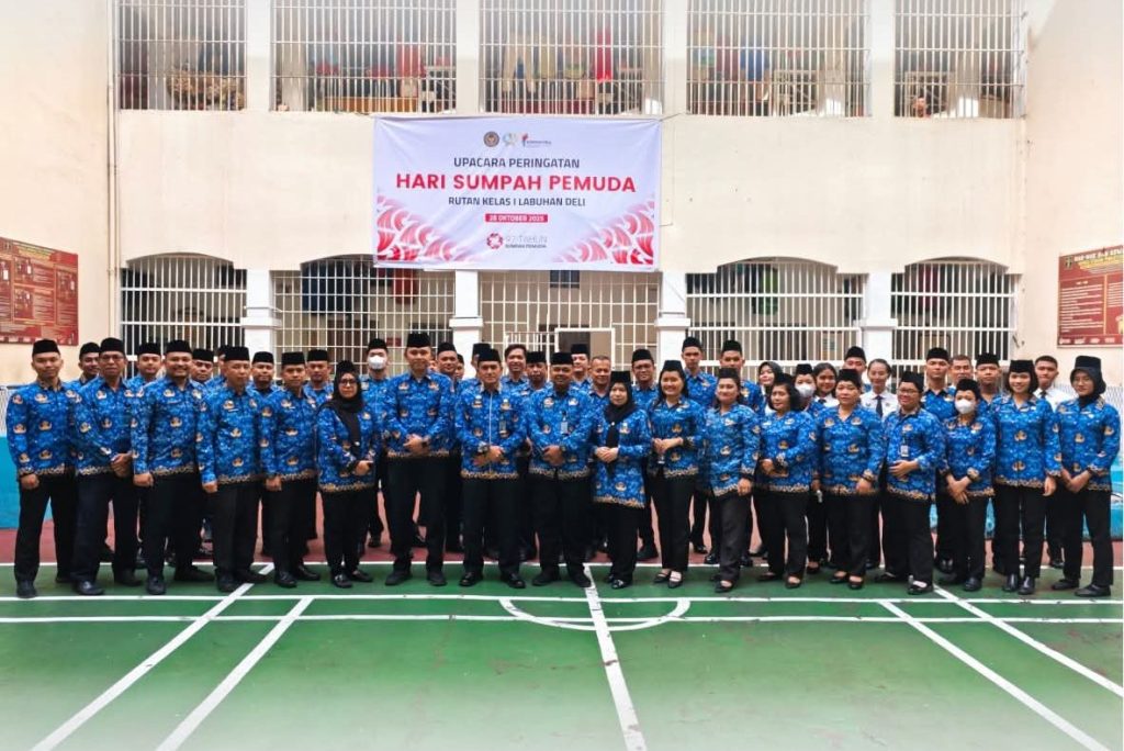MEDAN – Suasana penuh khidmat dan semangat kebangsaan terasa di halaman blok hunian Rumah Tahanan Negara (Rutan) Kelas I Labuhan Deli, saat seluruh jajaran pegawai dan warga binaan pemasyarakatan (WBP) mengikuti upacara peringatan Hari Sumpah Pemuda ke-97 Tahun 2025, pada Selasa (28/10/2025).