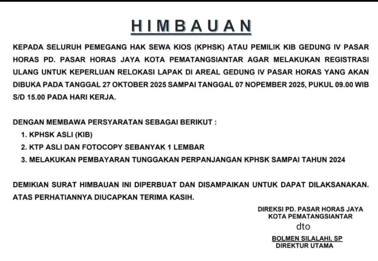 Pematangsiantar | Intipos.com –Manajemen Perusahaan Daerah Pasar Horas Jaya (PD PHJ) mengimbau kepada seluruh pemilik Kartu Pemilik Hak Sewa Kios...